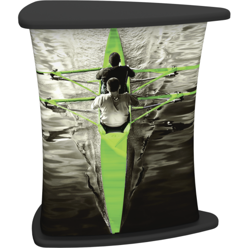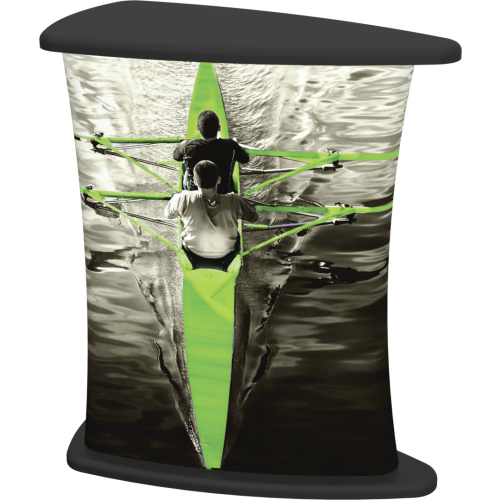 Bullet Reception Counter combines ultralight hardware together with dye sub printed stretch silicone edge fabric graphic (SEG) to offer a unique and functional reception stand with an oval tabletop.ย  Bullet Reception Counter table top is offered in four different colors. The printed fabric wraps around resulting in closed secure storage opportunity.