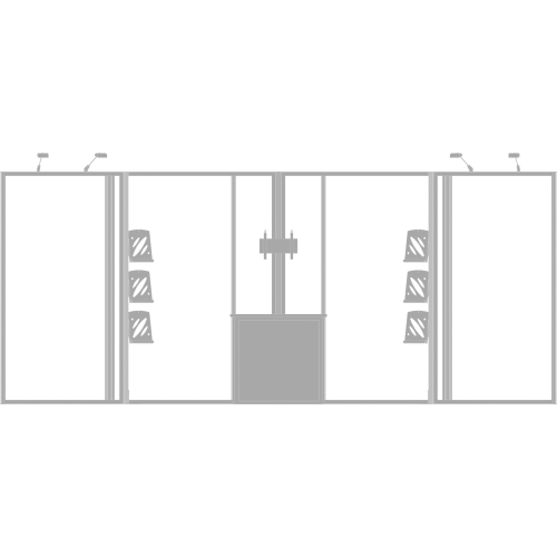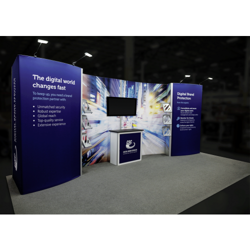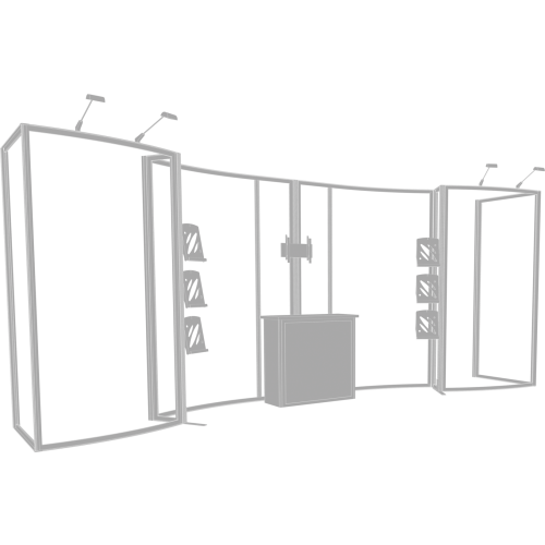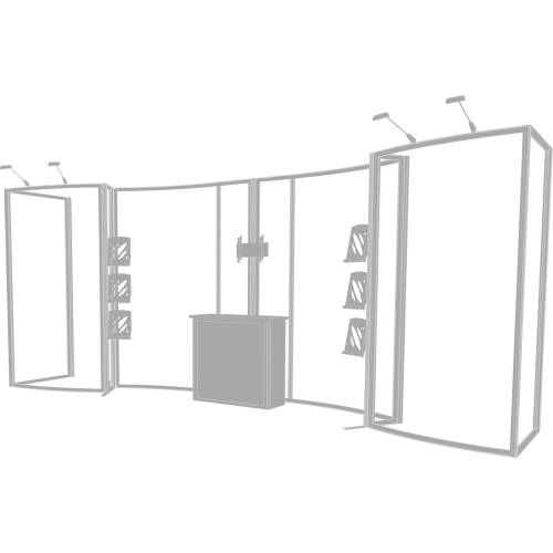 Hybrid 20ft Kit 10 is a perfect 10ft x 20ft inline display is a perfect display solution for the experienced exhibitor. Hybrid 20ft Kit 10ย combines aluminum frame sets, push-fit SEG Images and monitor mounts, combined with a backwall counter surfaces with lockable storage, literature rack accessories and LED spotlights. LED display spotlights illuminate the backwall and messaging for increased visibility. Kit 10 is reconfigurable into 10ft x 10ft.