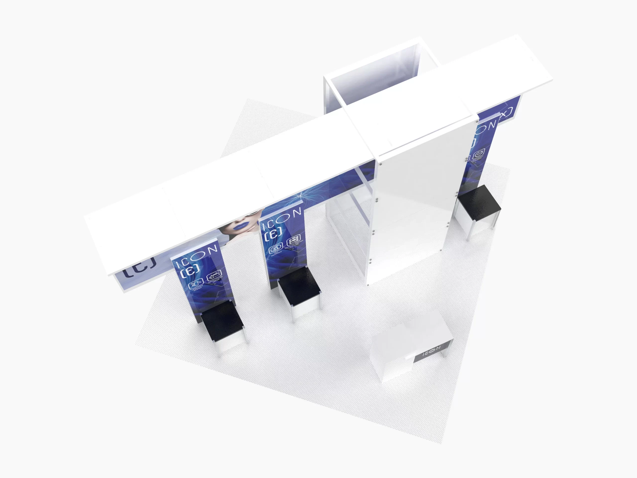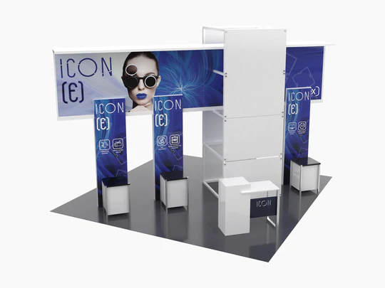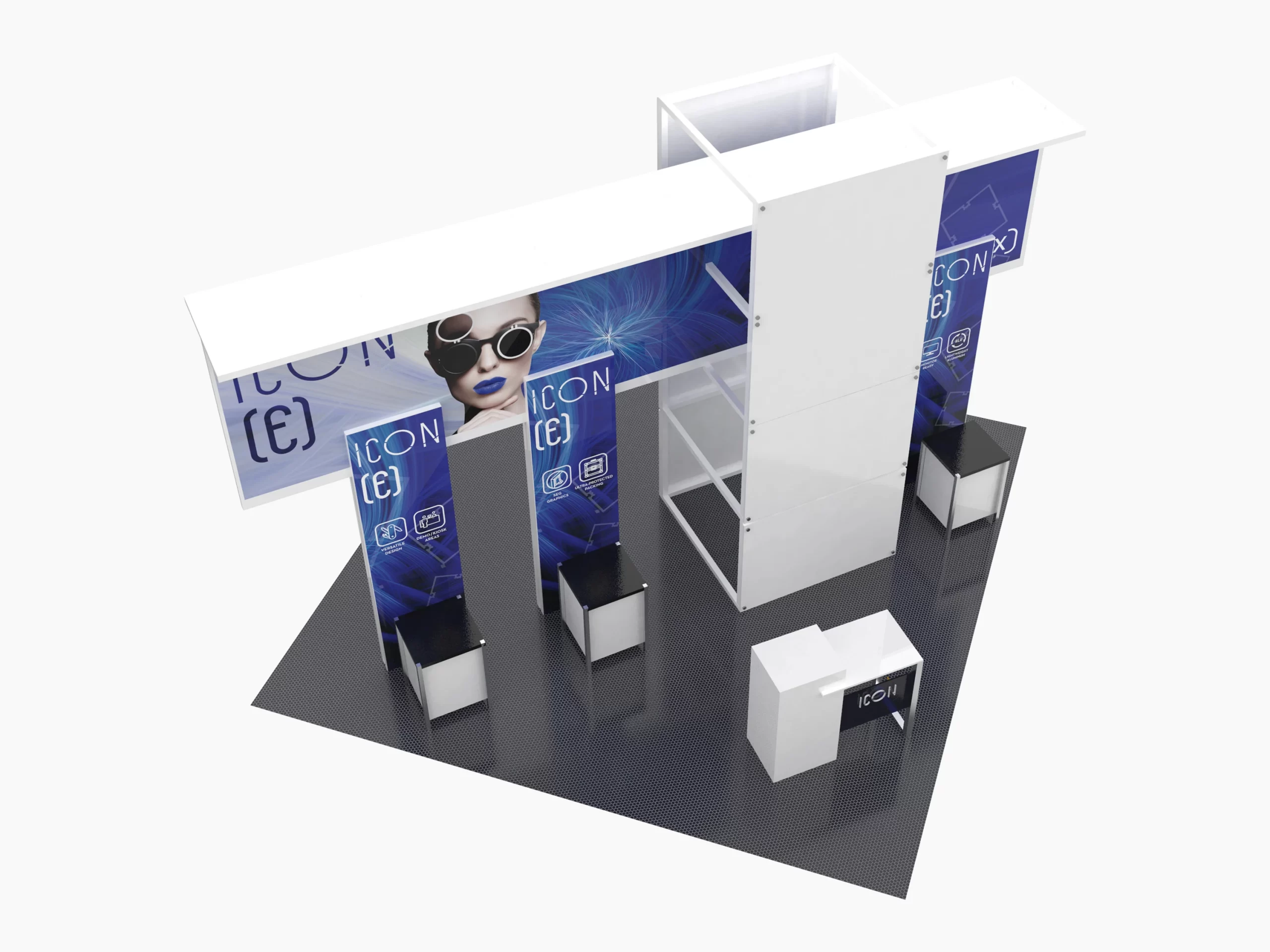 All ICON exhibits are variableย from 20 x 20 to 10 x 10 and are available in a variety of configurations. Options include kiosks, counters, shelves, back lighting, monitor mounts and more..