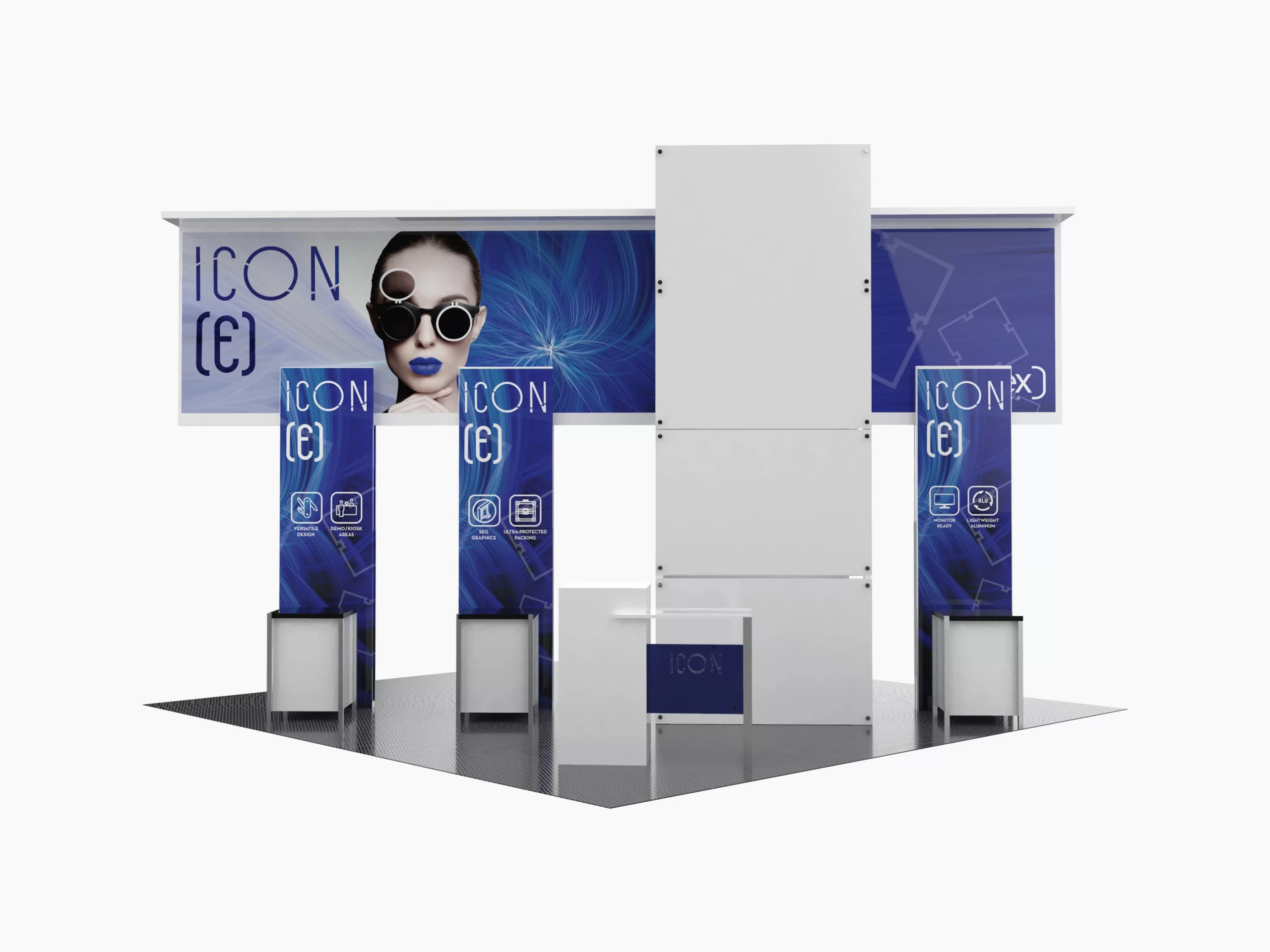 Variable from 10′ x 20′ to 20′ x 20′ and beyond, the ICON ‘D’ exhibit is offered in a variety of configurations and brings together two towers, One giant tower one smaller one. Graphics are dye-sublimation printed fabric graphics, two-sided demonstration areas for computer work and a generous offering of open space.