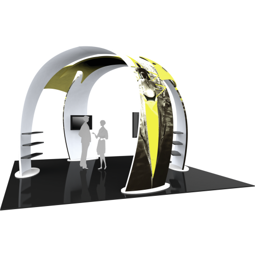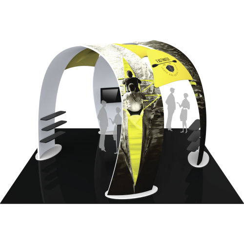 Island 20ft Fusion 07 offers ample floor space for traffic flow of visitors, product displays and demonstrations. The 12.5′ tall, 16′ wide curved shaped fabric arches offer areas within the spaceย to display products and merchandise on shelving, as well as a couple of areas for monitors to display digital media. It’s yours to discover for your next trade show convention.