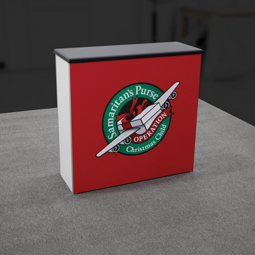 Modular Counter 03 is an perfect counter offering for any trade show exhibit display. This counter features accessible secure storage with locking doors and a white laminate cabinet. A front graphic panel offers an opportunity for branding. The solid countertop that comes in four color finish options. This Hybrid Pro Modular Counter 03 adds a functional, branded touch to any trade show exhibit or promotional event.
