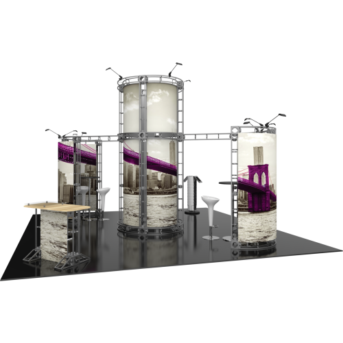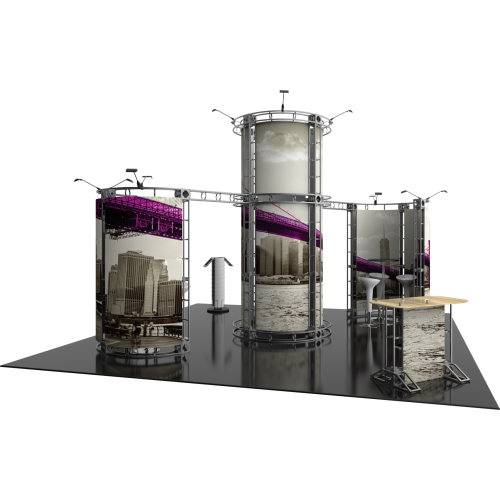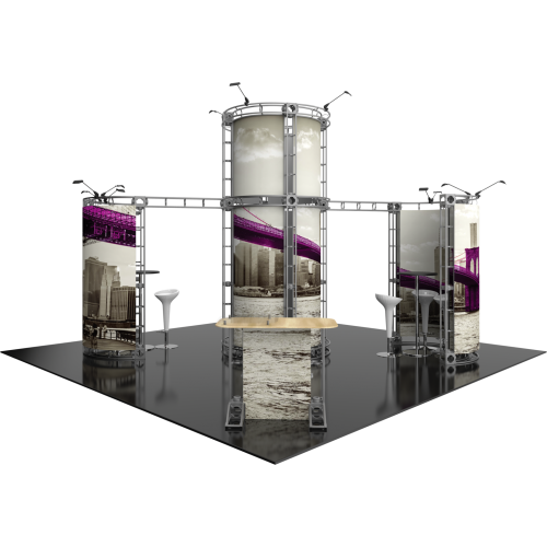 The Zenit 20ft x 20ft Island Truss™ exhibit is a modular display with lots of height which features several display accessories, these accessories pair extremely well with the sturdy steel truss frame. Zenit features a center tower 12ft high and accented by matching curved wings. Zenit is prominent and functionally perfect for product offerings. A curved reception counter is included to welcome visitors, and 12 low voltage spotlights illuminate and accent the entire exhibit display This kit Offers Dye sub printed graphics optionally.
