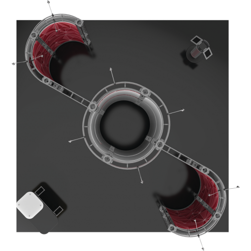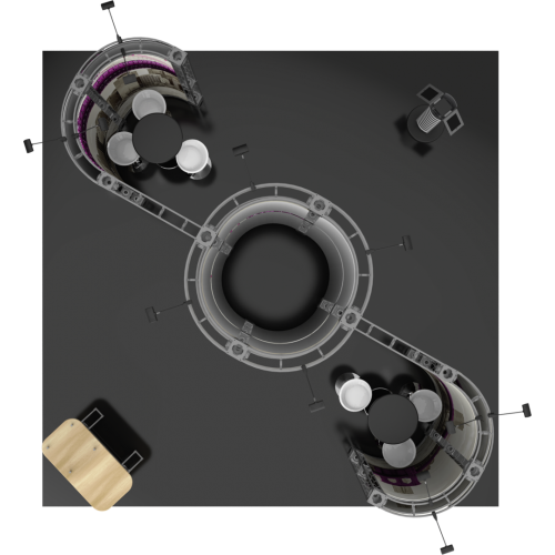 The Gemini 20ft x 20ft Island Truss™ exhibit is a modular display with lots of height which features several display accessories, these accessories pair extremely well with the sturdy steel truss frame. Zenit features a center tower 12ft high and accented by matching curved wings. Zenit is prominent and functionally perfect for product offerings. A curved reception counter is included to welcome visitors, and 12 low voltage spotlights illuminate and accent the entire exhibit display. This kit Offers Dye sub printed graphics optionally.
